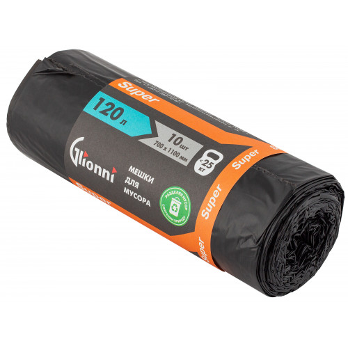 Мешки для мусора: 120л Super Glionni ПНД, черные, 22мкм,/25кг. 130*66см, 10шт/рул, 25рул/уп