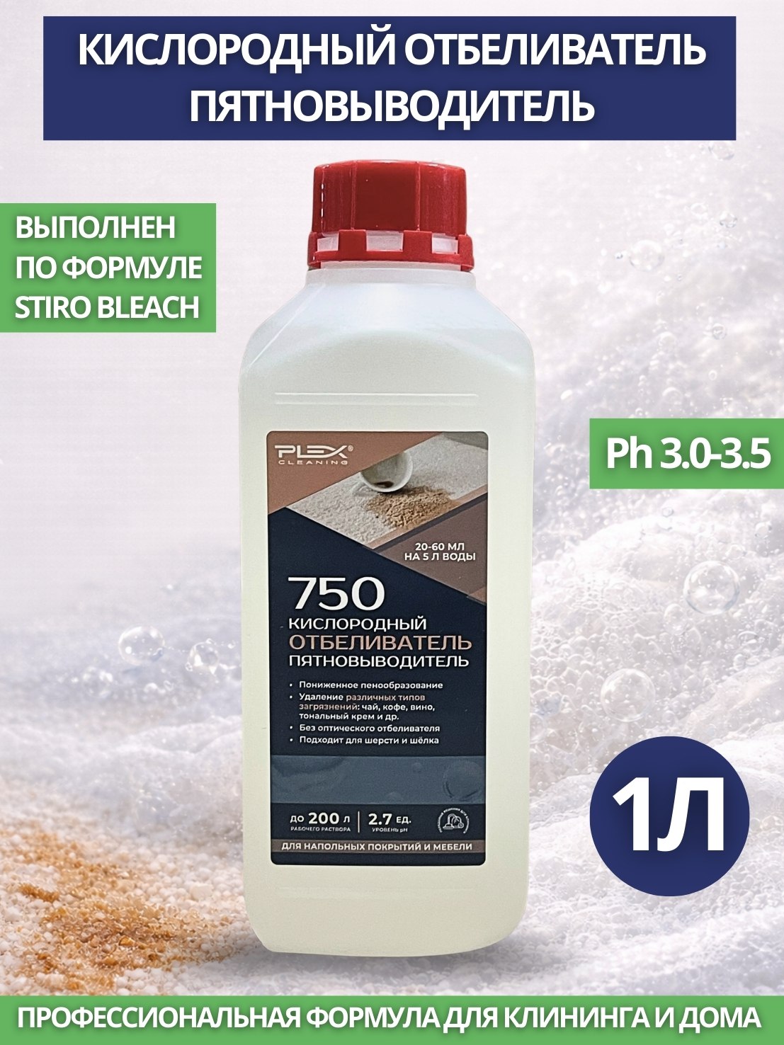 Специальный пятновыводитель-отбеливатель для проведения клининговых работ на текстильных изделиях и напольных покрытиях. Обладает сильным действием против широкого спектра пятен танинного происхождения, косметики, вина, некоторых пигментных загрязнений и многих других. имеет среднее пенообразование и не содержит оптического отбеливателя. Имеет стабилизированный состав для долгого хранения.