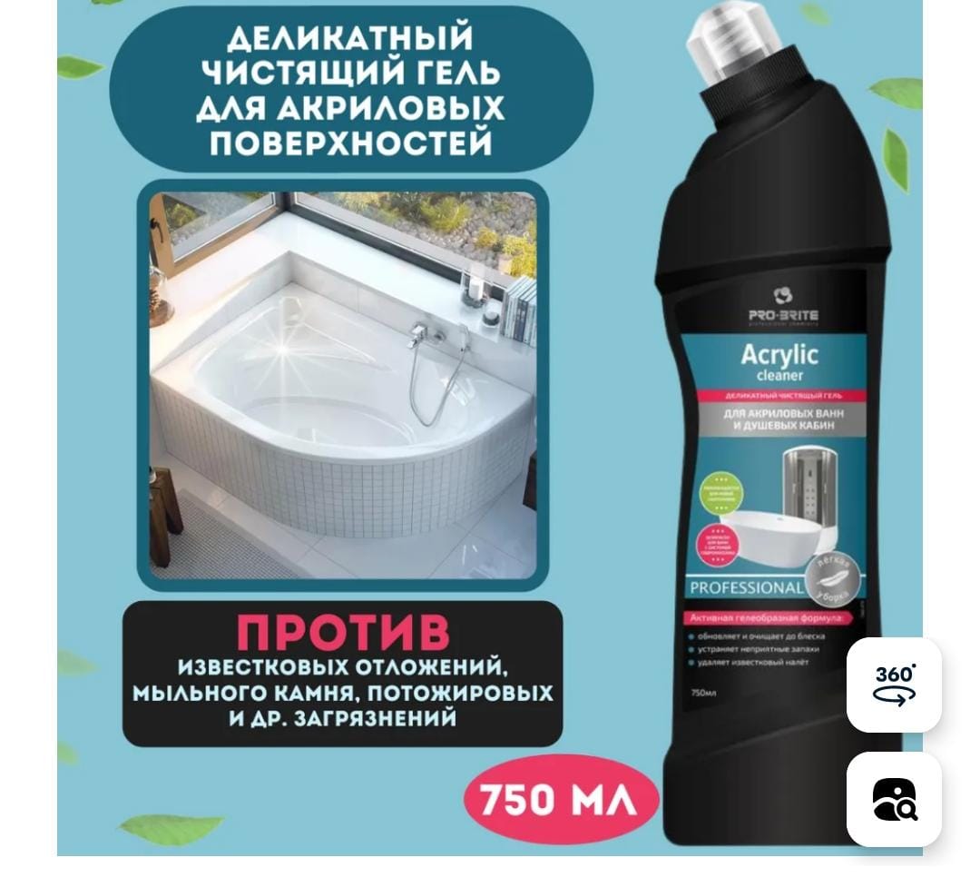 Чистящее средство для акриловых поверхностей. Эффективно для чистки акриловых и эмалированных ванн, душевых кабин, раковин, унитазов, а также кранов, вентилей и др. оборудования.