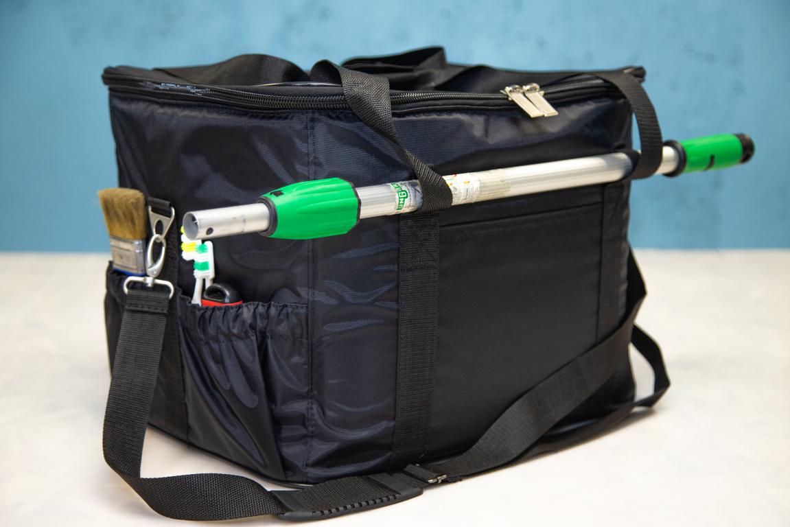 Для удобства транспортировки сумка имеет два вида ручек: короткие на липучке и длинный плечевой ремень с надежными креплениями. Дополнительно изделие оснащено тремя удобными карманами: для бутылки воды или инструмента; для документов, инструкций и других плоских предметов; для мелких необъемных предметов, листовок, визиток и т.д. Также имеется крепление для телескопической штанги.