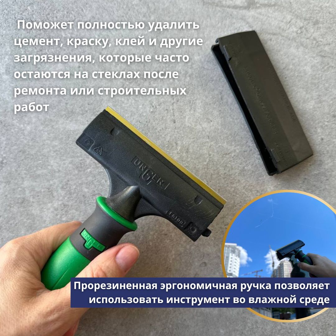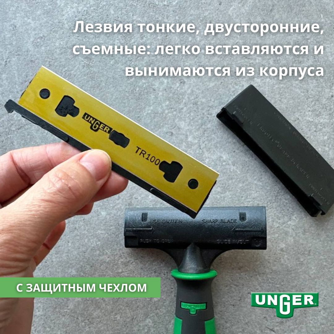 Лезвия тонкие, двусторонние, съемные: легко вставляются и вынимаются из корпуса. Для скребков на 10 см подходят двусторонние лезвия Unger ErgoTec Glass Scraper (10 см). Для скребков на 15 см подходят двусторонние лезвия Ettore (15 см) и Unger ErgoTec Glass Scraper (15 см). Скребок подходит для фиксации на любой из телескопических штанг фирмы Unger. Прорезиненная эргономичная ручка позволяет использовать инструмент во влажной среде.