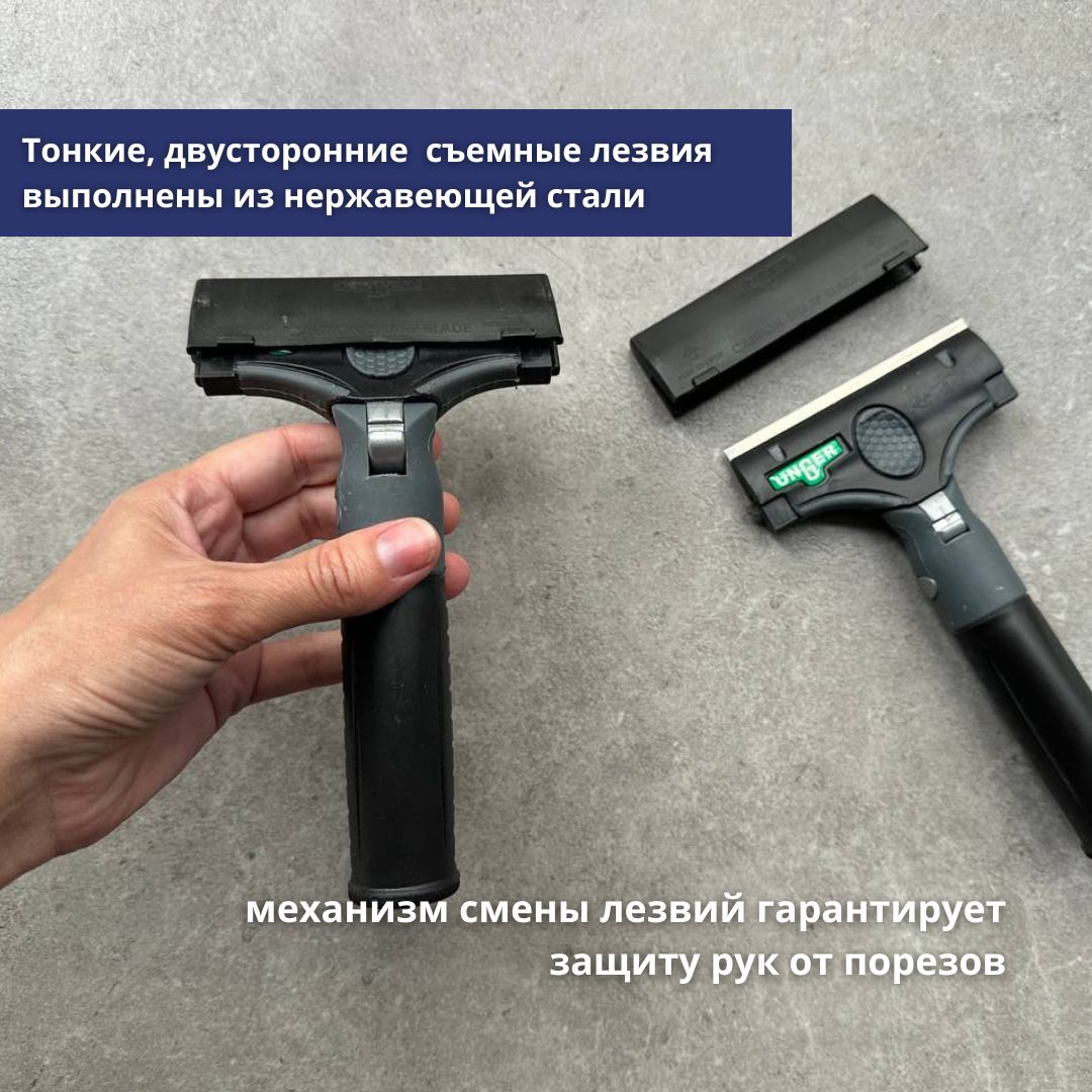 Специальная кнопка позволяет изменять рабочий угол от 0° до 30°. Тонкие, двусторонние лезвия выполнены из нержавеющей стали, обеспечивающие непревзойденную остроту режущей кромки в течение долгого времени. Лезвия съемные: легко вставляются и вынимаются из корпуса. Новейший сверхнадежный механизм смены лезвий, гарантирующий защиту рук от порезов. Защитный пластиковый чехол, обеспечивающий безопасность при хранении. Совместим с телескопическими штангами Unger. Скребок используется со стальными лезвиями арт. ENB10.