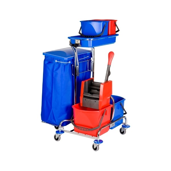 Хромированная база, ведра 2х17 л (синее и красное), отжимное устройство VK3 (красное), 1 лоток (под дополнительные ведра), 2 ведра по 6 л (синее и красное), рама-держатель для мешка 120 л, держатель рукоятки мопа.